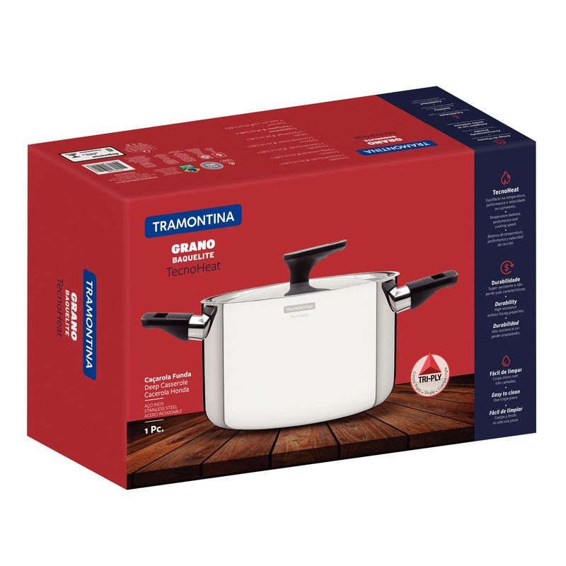 ElectrohogarPequeños ElectrodomésticosJuego de OllasCacerola Grano Baquelite honda de acero inoxidable con cuerpo triple, tapa y asas de baquelita de 24 cm y 5,8l Tramontina