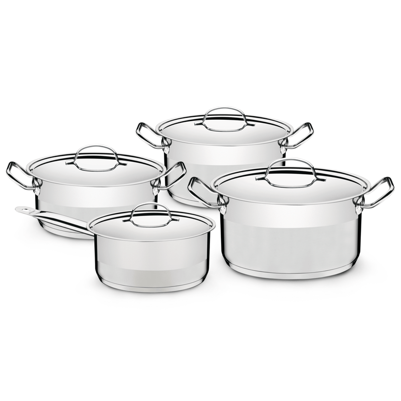 ElectrohogarPequeños ElectrodomésticosJuego de OllasJuego de Ollas Professional de acero inoxidable fondo triple con tapa plana detalle satinado 8 piezas